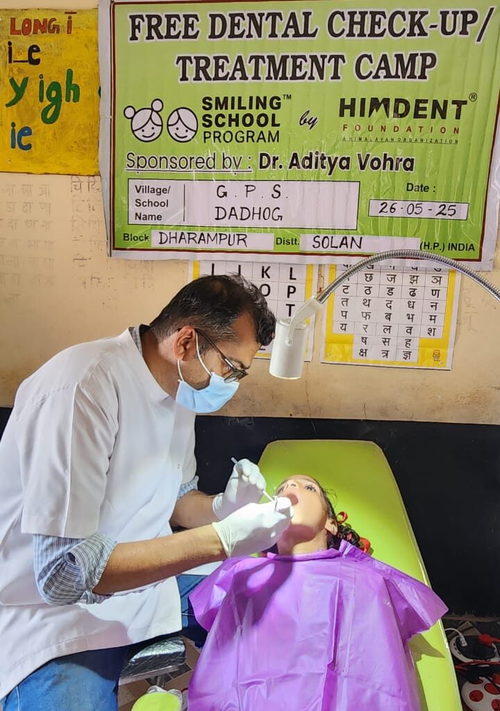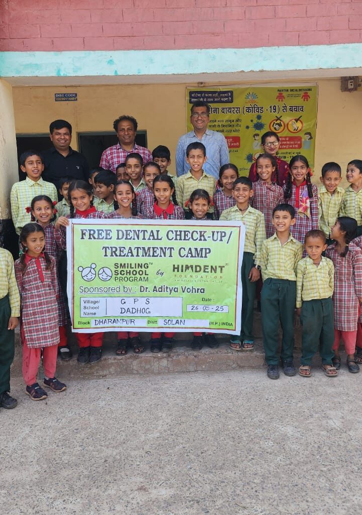 As part of its continued collaboration with Samagra Shiksha, Himachal Pradesh, Himdent Foundation successfully organised a three-day free dental treatment camp under the Smiling Schools programme at Government Primary School (GPS) Dadhog from 26th to 28th May 2025. The camp was organised with the aim to improve oral health awareness and provide preventive and restorative dental care.